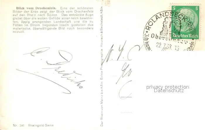 Drachenfels Blick vom Drachenfels auf den Rhein Drachenfels postalisch gelaufen 1938 Erhaltung siehe scans [LiesaD40] LiesID40