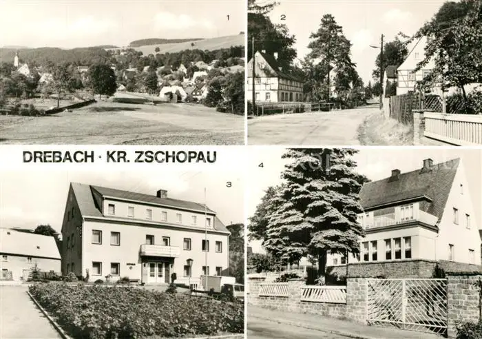 Drebach Panorama Hauptstrasse Rathaus Kinderkrippe Drebach postalisch nicht gelaufen nach 1965 Erhaltung siehe scans [KathaD81] Kathoren