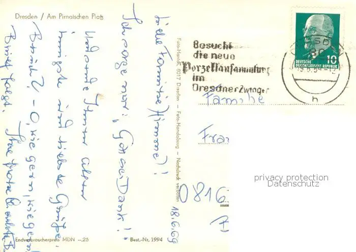 Dresden_Elbe Am Pirnaischen Platz postalisch gelaufen 1969 Erhaltung siehe scans [FriedD77] Frierer