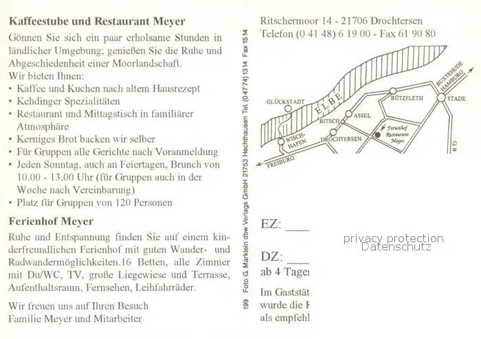 Drochtersen Kaffeestube und Restaurant Meyer Gastraeume Terrasse Drochtersen postalisch gelaufen nach 1965 Werbekarte (keine Postkarte) Erhaltung siehe scans [WerneD78] Werbekarte (keine Postkarte) WernPID7