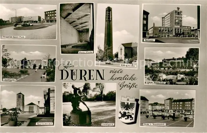 AK / Ansichtskarte Dueren_Rheinland Rathaus Stadtpark Friedrich Ebert Platz Anna Kirche Marienkirche Hallenbad Evang.Kirche Dueren_Rheinland