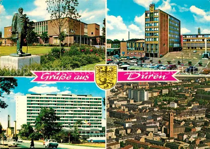 AK / Ansichtskarte Dueren_Rheinland Zentrum Fliegeraufnahme Hochhaeuser Denkmal Statue Dueren_Rheinland
