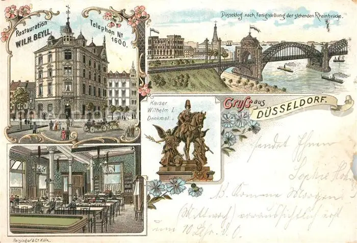 Duesseldorf Kategorie Alte Ansichtskarten Postkarten bx88174 Duesseldorf Restauration Wilh Beyll Rheinbruecke Kaiser Wilhelm I Denkmal Duesseldorf postalisch gelaufen 1899 Erhaltung siehe scans [WerneD78]