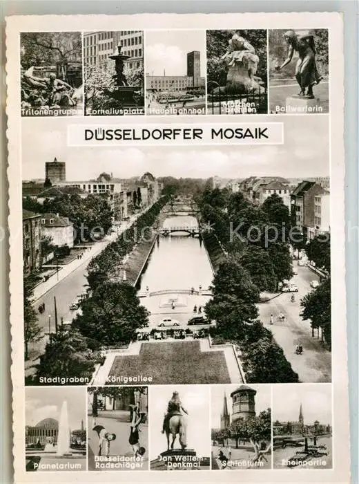 Duesseldorf Tritonengruppe Hauptbahnhof Ballwerferin Stadtgraben Koenigsallee Planetarium Radschlaeger Jan Wellem Denkmal Schlossturm Rheinpartie Duesseldorf postalisch nicht gelaufen 1921-1965 Erhaltung siehe scans [WerneD78] WernPID7