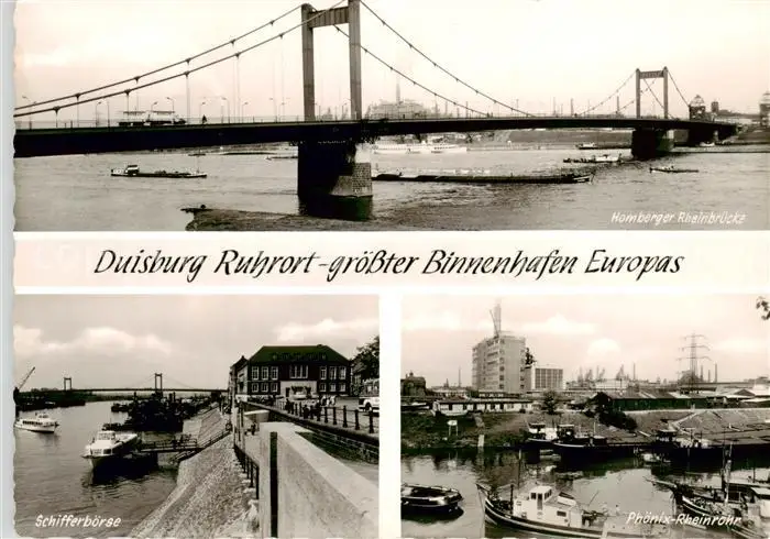 AK / Ansichtskarte Duisburg__Ruhr Groesster Binnenhafen Europas Homberger Rheinbruecke Schifferboerse Phoenix Rheinrohr