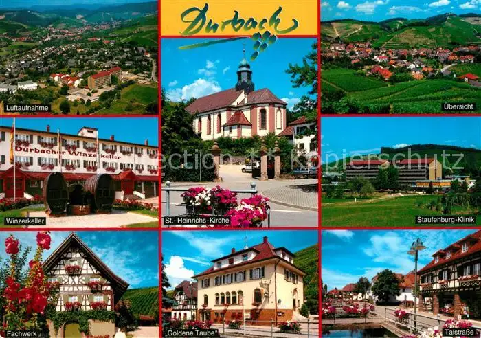 AK / Ansichtskarte Durbach Fliegeraufnahme Winzerkeller Fachwerk St Heinrichs Kirche Goldene Taube Panorama Staufenburg Klinik Talstrasse Durbach