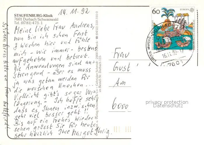 Durbach Staufenburg-Klinik Durbach postalisch gelaufen 1992 Erhaltung siehe scans [NatalD47] NataID47