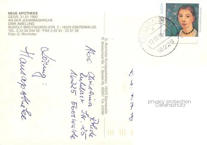 Eberswalde Neue Apotheke Eberswalde postalisch gelaufen 1996 Erhaltung siehe scans [WerneD78] WernPID7