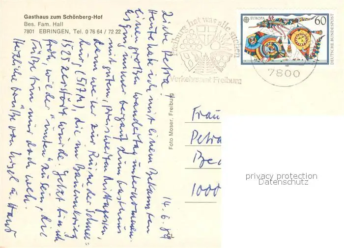 Ebringen_Breisgau Gasthaus zum Schoenberg Hof Blick auf Freiburg Panorama Ebringen Breisgau postalisch gelaufen 1989 Erhaltung siehe scans [WerneD78] WernPID7