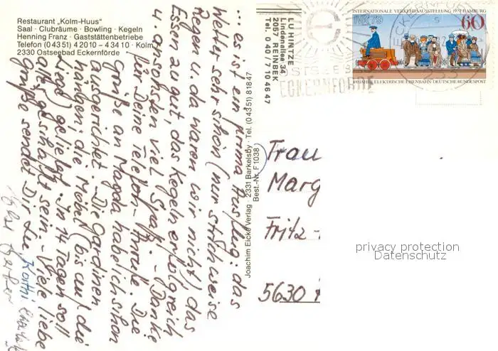 Eckernfoerde Restaurant Kolm-Huus Saal Kamin Kegelbahnen Bowling Eckernfoerde postalisch gelaufen 1982 Erhaltung siehe scans [FriedD77] Frierer