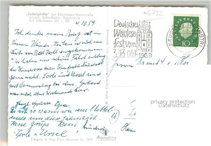 Edenkoben Fliegeraufnahme Ludwigshoehe Schloss Schlosshotel Sportschule Edenkoben postalisch gelaufen 1959 Erhaltung siehe scans [WerneD78] WernPID7