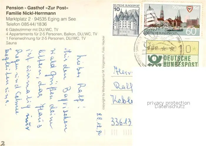 Eging_See Pension Gasthof Zur Post Restaurant Fremdenzimmer Eging_See postalisch gelaufen 1994 Erhaltung siehe scans [FriedD77] Frierer