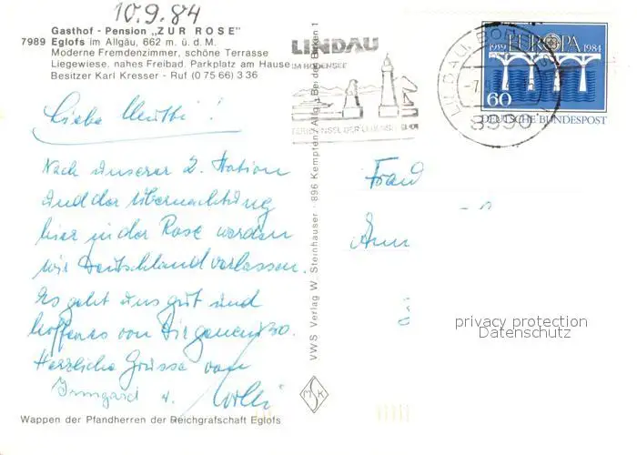 Eglofs_Argenbuehl Gasthof Pension Zur Rose Eglofs Argenbuehl postalisch gelaufen 1984 Erhaltung siehe scans [FriedD77] Frierer