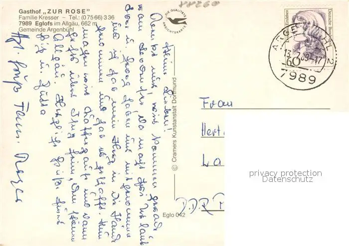 Eglofs_Argenbuehl Gasthof Zur Rose Restaurant Alpenblick Fliegeraufnahme Eglofs Argenbuehl postalisch gelaufen 1989 Erhaltung siehe scans [FriedD77] Frierer