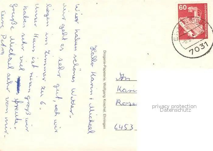 Ehningen_Boeblingen Kirche in Mauren Wasserschloss Festhalle Kammerer Schule Ev Kirch Ehningen Boeblingen postalisch gelaufen 1985 Erhaltung siehe scans [WerneD78] WernPID7