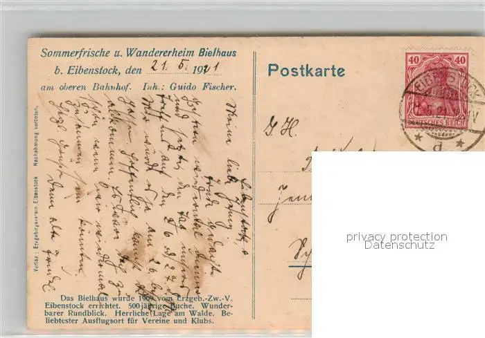 Eibenstock Wanderheim Bielhaus Eibenstock postalisch gelaufen 1921 Erhaltung siehe scans [KathaD81] Kathoren