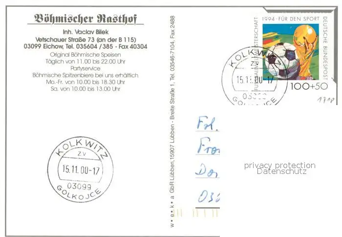 Eichow Boehmischer Rasthof Restaurant Eichow postalisch gelaufen 2000 Erhaltung siehe scans [FriedD77] Frierer