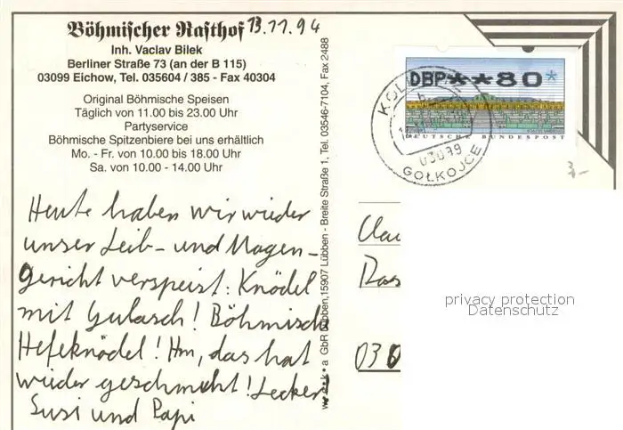 Eichow Boehmischer Rasthof und Pension Restaurant Eichow postalisch gelaufen 1994 Erhaltung siehe scans [FriedD77] Frierer