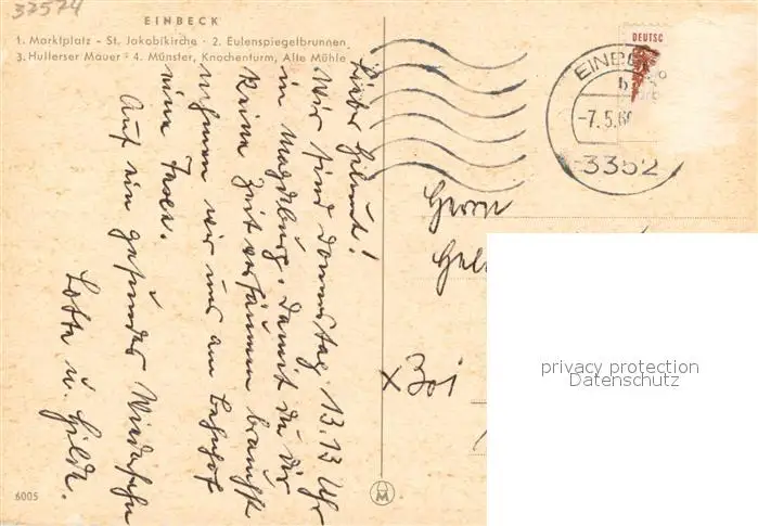 Einbeck_Niedersachsen Marktplatz St. Jakobikirche Eulenspiegelbrunnen Hullerser Mauer Muenster Knochenturm Alte Muehle Einbeck Niedersachsen postalisch gelaufen ca. 1968 Erhaltung siehe scans [FriedD77] Frierer