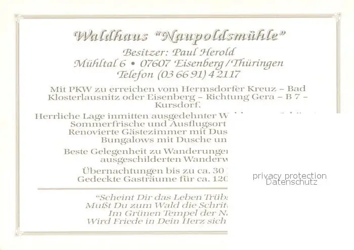 Eisenberg_Thueringen Waldgasthof Naupoldsmuehle Eisenberg Thueringen postalisch nicht gelaufen nach 1965 Werbekarte (keine Postkarte) Erhaltung siehe scans [FriedD77] Werbekarte (keine Postkarte) Frierer