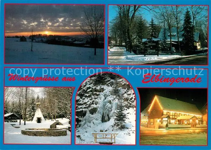 AK / Ansichtskarte Elbingerode_Harz Winterlandschaft Sonnenuntergang Schneiderstube Handarbeitsladen Nachtaufnahme Elbingerode Harz
