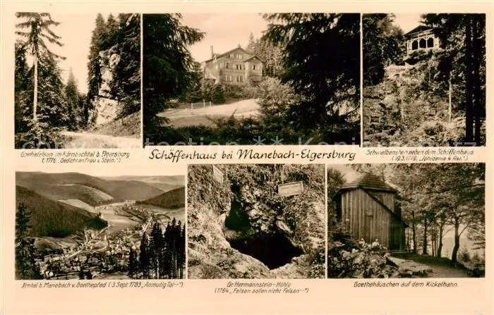 AK / Ansichtskarte Elgersburg Goethefelsen im Koernbachtal Schoeffenhaus Schwalbenstein neben dem Schoeffenhaus Panorama Gr Hermannstein Hoehle Goethehaeuschen auf dem Kickelhahn Elgersburg