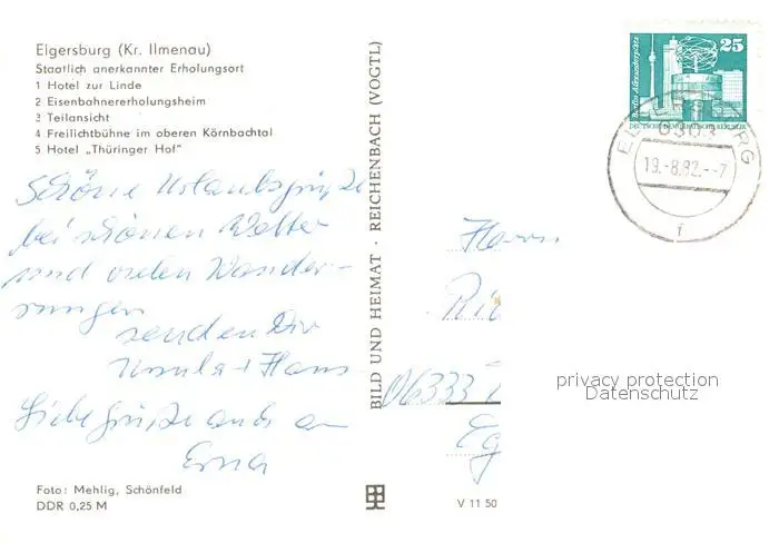 Elgersburg Hotel zur Linde Eisenbahnerholungsheim Freilichtbuehne Koernbachtal Hotel Thueringer Hof Elgersburg postalisch gelaufen 1982 Erhaltung siehe scans [FriedD77] Frierer
