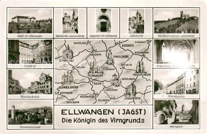 Ellwangen_Jagst Schloss Schlosshof Marienstrasse Panorama Stiftskirche Suedportal Wallfahrtskirche Schoenenberg Kreuzgang Marktplatz Pfarrgasse Ellwangen_Jagst postalisch nicht gelaufen 1921-1965 Erhaltung siehe scans [WerneD78] WernPID7