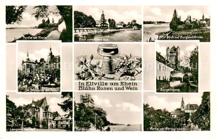 Eltville_Rhein Partie am Rhein Langwerther Hof Burg Kirche Rosenbluete Wein Eltville_Rhein postalisch gelaufen 1960 Erhaltung siehe scans [FriedD77] Frierer