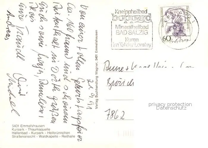 Emmelshausen Konzertpavillon Park Kuranlagen Strassenpartie Bildstock Sportplatz Emmelshausen postalisch gelaufen 1991 Erhaltung siehe scans [WerneD78] WernPID7