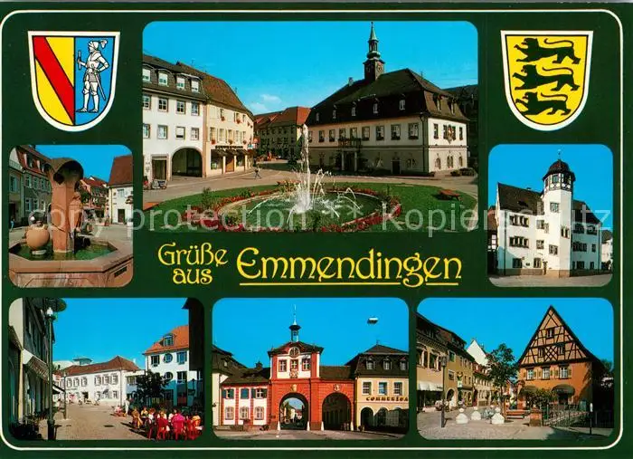 AK / Ansichtskarte Emmendingen Brunnen Marktplatz Innenstadt Torbogen Tor zu Schwarzwald und Kaiserstuhl Wappen Emmendingen