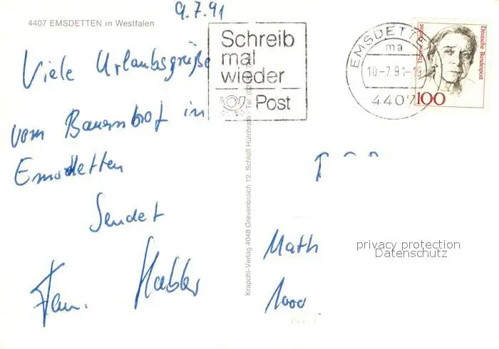 Emsdetten Sandufer Kirchstrasse Sankt Pankratius Rathaus Brunnen Morgentau Emsdetten postalisch gelaufen 1991 Erhaltung siehe scans [KathaD81] Kathoren