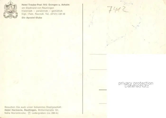 Eningen_Achalm Hotel Traube Post Die Apostel Stube Eningen Achalm postalisch nicht gelaufen 1921-1965 Erhaltung siehe scans [FriedD77] Frierer