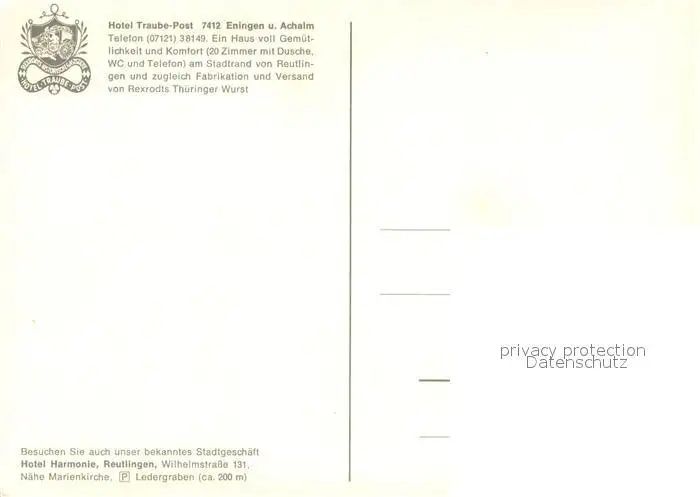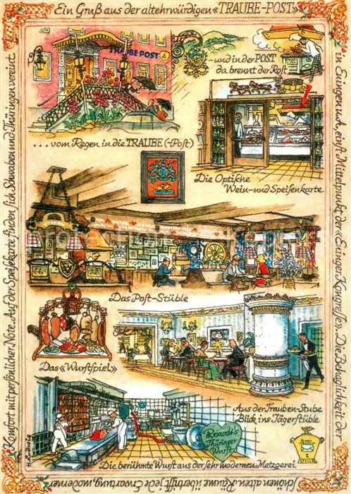 Eningen_Achalm Hotel Traube Post Post Stueble Wurfspiel Jaegerstueble Metzgerei Illustration Eningen Achalm postalisch nicht gelaufen nach 1965 Erhaltung siehe scans [WerneD78] WernPID7
