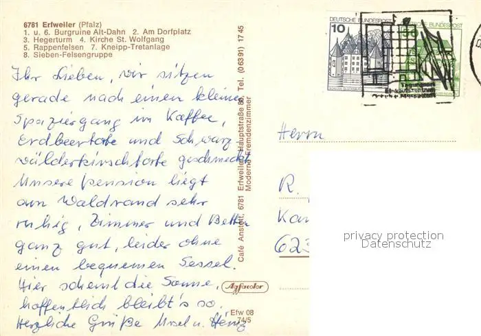 Erfweiler_Pfalz Burgruine Alt Dahn Dorfplatz Hegerturm Kirche Sankt Wolfgang Rappenfelsen Erfweiler_Pfalz postalisch gelaufen nach 1965 Erhaltung siehe scans [KathaD81] Kathoren