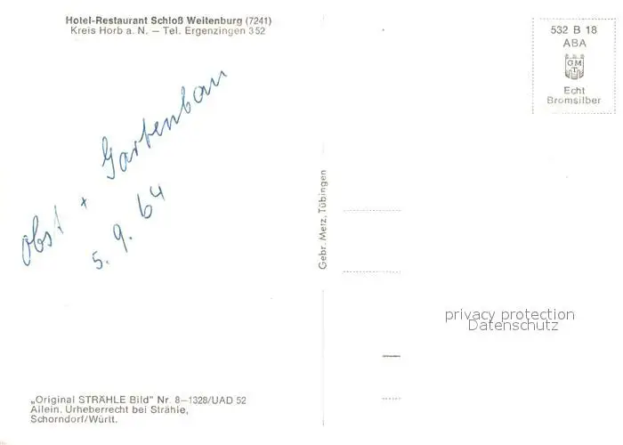 Ergenzingen Hotel Restaurant Schloss Weitenburg Fliegeraufnahme Original Straehle Bild Nr. 8-1328 Ergenzingen postalisch nicht gelaufen 1964 Erhaltung siehe scans [FriedD77] Frierer