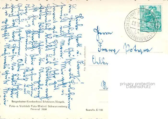 Erlabrunn_Erzgebirge Bergarbeiter Krankenhaus Erlabrunn_Erzgebirge postalisch gelaufen 1961 Erhaltung siehe scans [FriedD77] Frierer