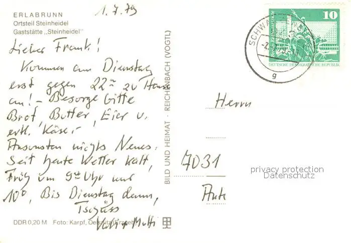Erlabrunn_Erzgebirge Gaststaette Steinheidel Erlabrunn_Erzgebirge postalisch gelaufen 1979 Erhaltung siehe scans [LiesaD40] LiesID40