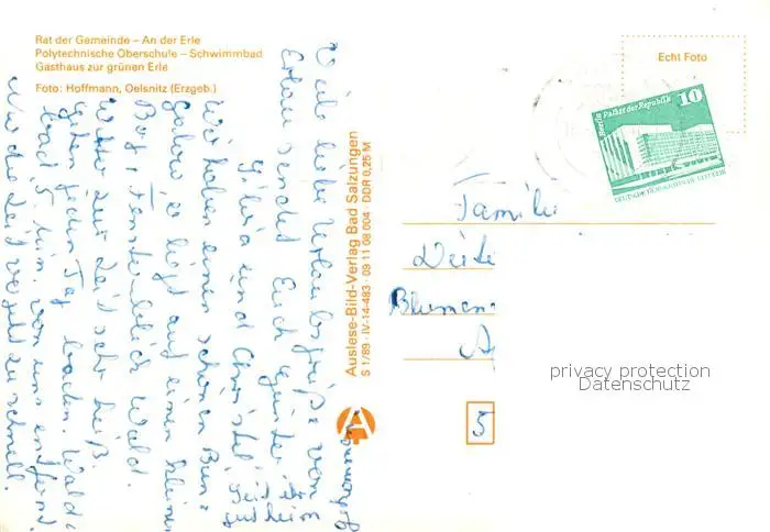 Erlau_Thueringen Rat der Gemeinde An der Erle Polytechnische Oberschule Schwimmbad Gasthaus zur gruenen Erle Erlau_Thueringen postalisch gelaufen nach 1965 Erhaltung siehe scans [FriedD77] Frierer