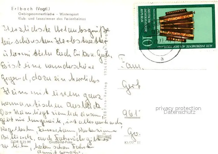 Erlbach_Vogtland Ferienheim Klubzimmer Lesezimmer Gebirgssommerfrische Erlbach_Vogtland postalisch gelaufen 1977 Erhaltung siehe scans [FriedD77] Frierer