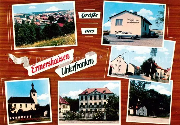 Ermershausen Unterfranken Kategorie Alte Ansichtskarten Postkarten bx53050 Ermershausen_Unterfranken Panorama Sportheim Kirche Villa Strassenpartie Ermershausen Unterfranken postalisch nicht gelaufen nach 1965 Erhaltung siehe scans [WerneD78]