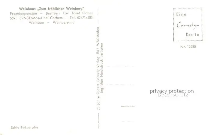 Ernst_Cochem Weinhaus Zum froehlichen Weinberg Urkunde Pension Weintrauben Weinflasche Cornely Karte Nr. 12280 Ernst_Cochem postalisch nicht gelaufen nach 1965 Erhaltung siehe scans [FriedD77] Frierer