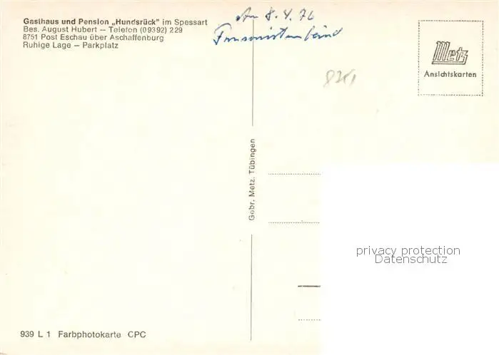 Eschau_Unterfranken Gasthaus und Pension Hundsrueck Eschau Unterfranken postalisch gelaufen 1976 Erhaltung siehe scans [FriedD77] Frierer