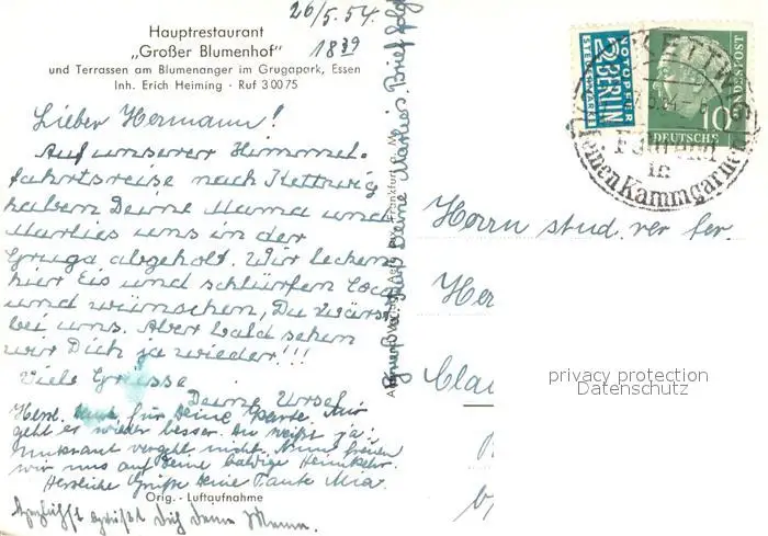 Essen_Ruhr Kategorie Alte Ansichtskarten Postkarten bx93820 Essen_Ruhr Grugapark Hauptrestaurant Grosser Blumenhof und Terrassen Fliegeraufnahme Essen_Ruhr postalisch gelaufen 1954 Erhaltung siehe scans [WerneD78]