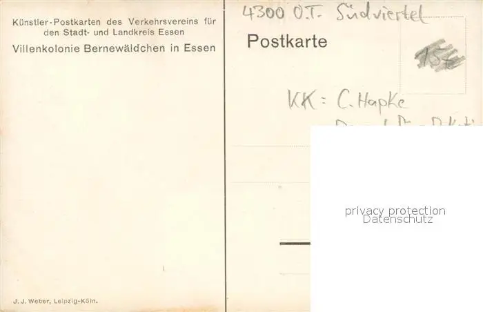 Essen__Ruhr Kuenstlerkarte C. Hapke Villenkolonie Bernewaeldchen Suedviertel postalisch nicht gelaufen 1921-1965 Erhaltung siehe scans [LiesaD40] LiesID40