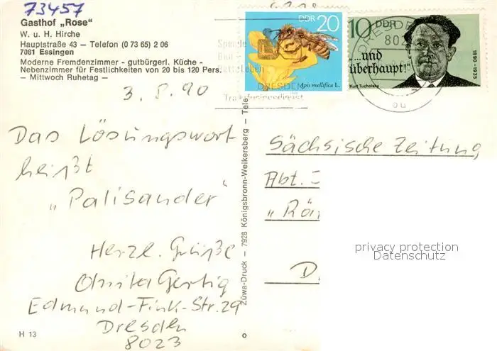 Essingen Gasthof zur Rose Restaurant Essingen postalisch gelaufen 1990 Erhaltung siehe scans [FriedD77] Frierer