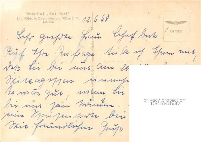 Ettal Gasthof Zur Post Ettal postalisch nicht gelaufen 1968 Erhaltung siehe scans [FriedD77] Frierer
