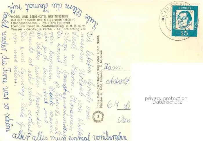 Ettenhausen_Schleching Hotel und Berghotel Breitenstein mit Geigelstein und Breitenstein Ettenhausen_Schleching postalisch gelaufen 1965 Erhaltung siehe scans [WerneD78] WernPID7