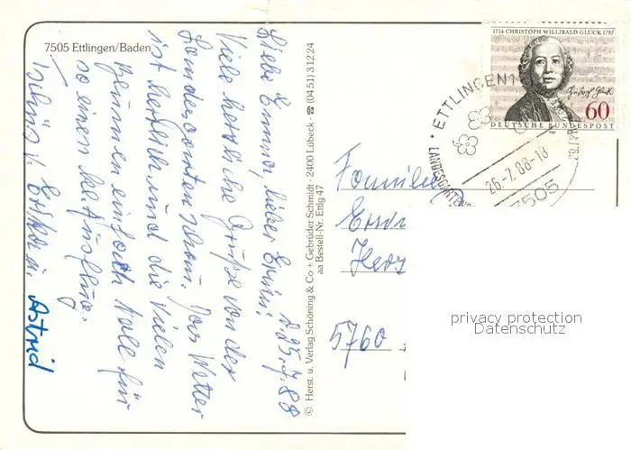 Ettlingen Partie an der Alb Blumen Stadtpanorama Ettlingen postalisch gelaufen 1988 Erhaltung siehe scans [FriedD77] Frierer