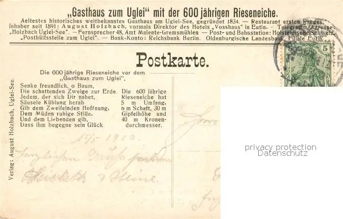 Eutin Historisches Gasthaus zum Uglei am Ugleisee 600jaehrige Rieseneiche Bilderrahmen Eutin postalisch gelaufen bis 1920 Erhaltung siehe scans [FriedD77] Frierer